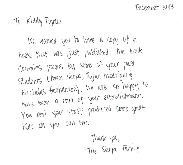 Our Alumni, Aven Serpa, Ryan Madrigal, and Nicholas Hernandez were recently published in “A Celebration of Poets”; a nationwide competition for all grades K thru 6th just this past year!