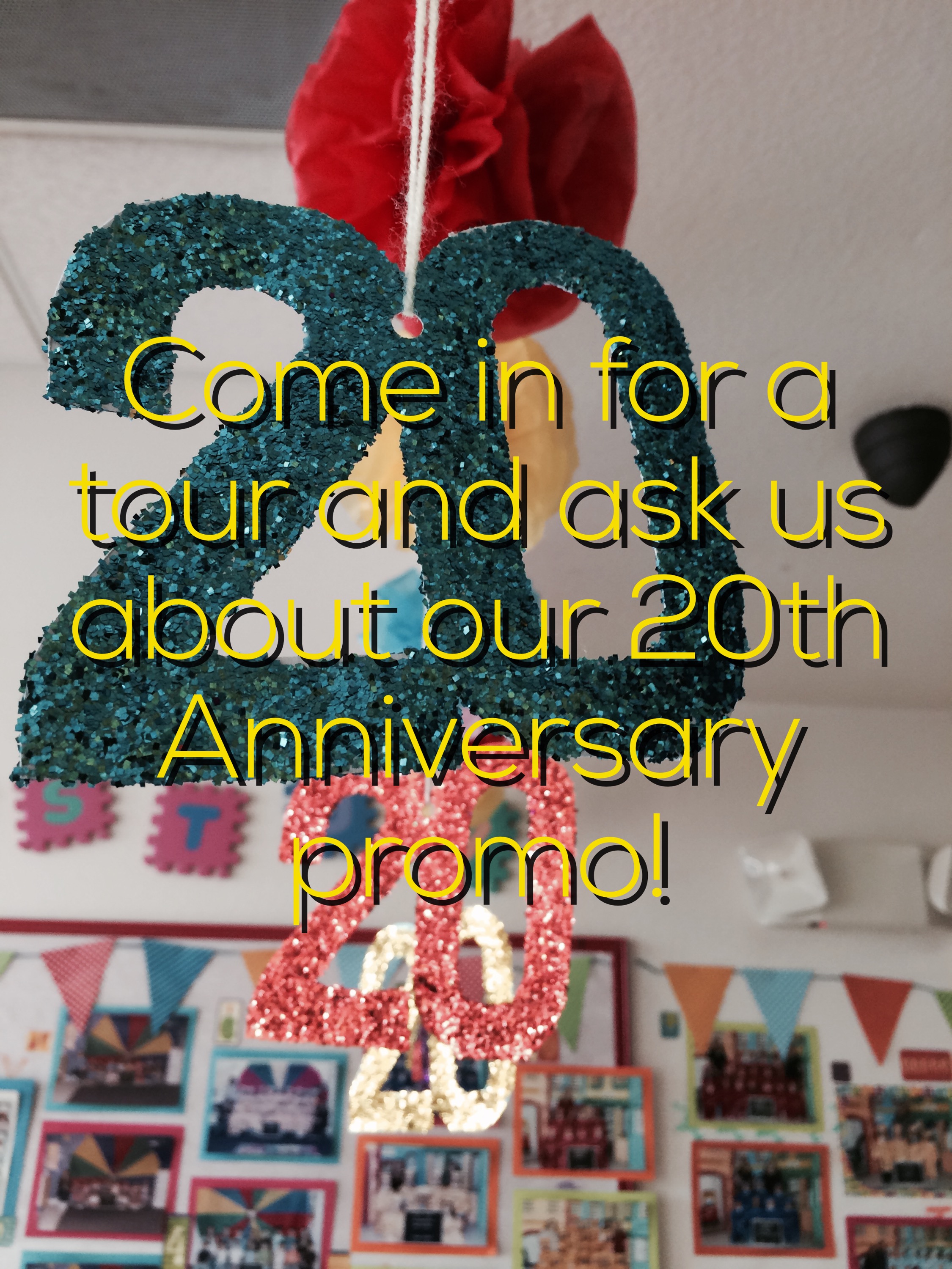 20th Anniversary Special! In honor of Kiddy Tyme’s 20th anniversary celebration in 2016, we have a special enrollment discount. Please come by the school and ask us about it. Share this: Click to share on Facebook (Opens in new window) Facebook Like Loading... Related